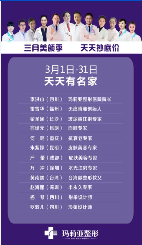 导读:明天!明天!明天! 玛莉亚美颜庆典全城启动! 3月美颜季 天天抄底折,人人有礼拿! 更有众多大牌专家和新技术助阵! 这个3月,让宜宾美起来! 玛莉亚整形尊贵会员首次开放办理 会员中心开放 最高可享受 5 折优惠! 积分还可兑换礼品哦! 优惠太多!惊喜太多